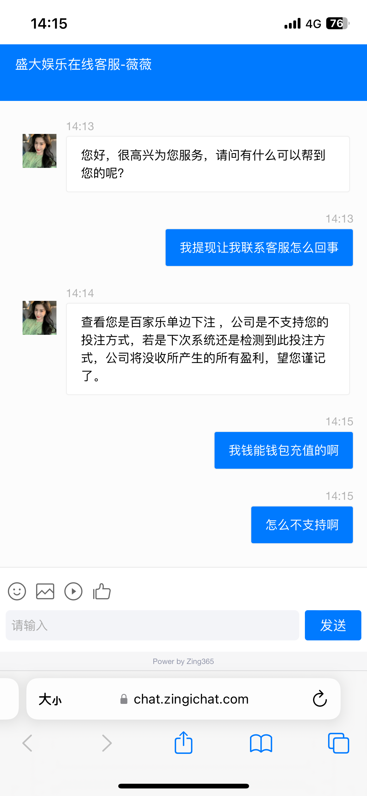 本人盛大两个号  一个真人v2 一个真人V1 两号提的都是800都被卡款警告  当时我玩的AG真人他客服给我说必须每隔两三局必须买一次和牌 不然就注单异常  另一个是玩的体育 说只能玩五大联赛不然下次注单就异常收回盈利! 最后再三保证下次不会才给出了  看图尽早避雷吧