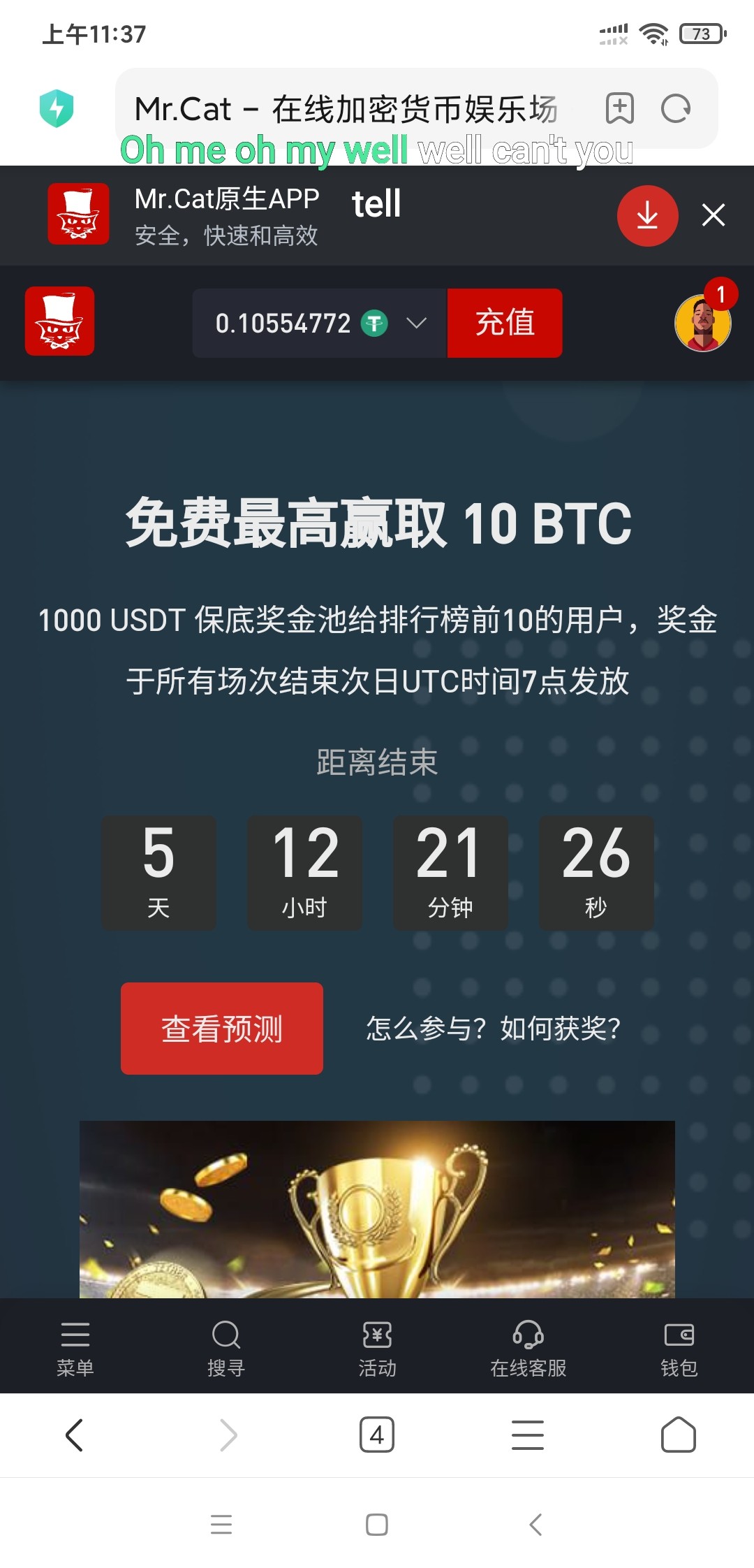 注册了一个月,每天签到给狗屎币1000没卵用,赢到几十万也不给提现。竞猜参与了好几次,一次都没有全中过。一分彩金都没嫖到过。