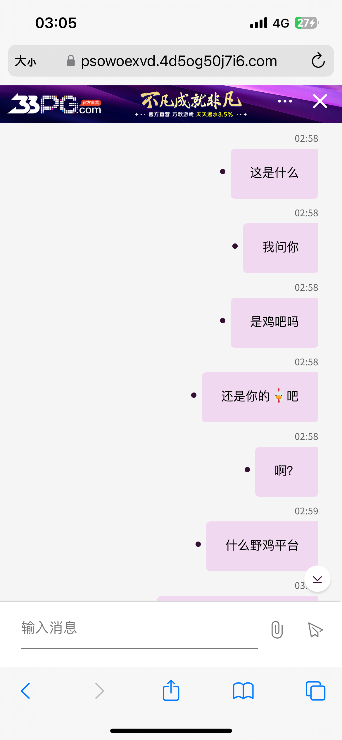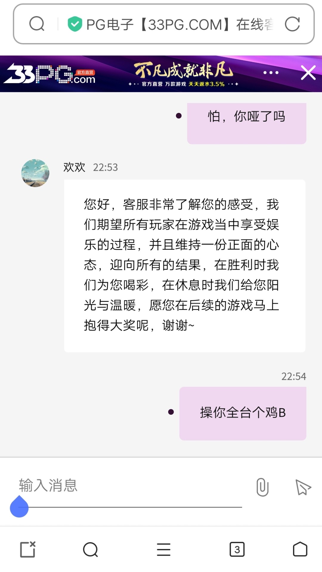 避雷33pg.com,冲了一共2700,提款7650直接黑款,理由不接受此注单,提款的时候联系客户,客户说财务正在处理出款,然后过了一小时半,确实处理出款了,给我盈利的钱扣掉了,给我退1000本金,让我强制玩电子,并且重新打码一倍流水,就因为在他们平台是新用户,没有负盈利,玩转盘进了个100倍,不敢给出款,一点格局都没有的平台大家记得避雷,去其他平台今天输一万,果然还是黑台好赢钱,现在赌的我真犯恶心,输的时候一直输,赢的时候各种理由卡你款,网络赌博就是诈骗,冲了不一定赢,赢了不一定给,给了不一定出,出了还冻你卡,恶心至极,当冲钱让大家见识一下黑台了,一定记得避雷,帮忙骂客户的留下收款码给你们红牛