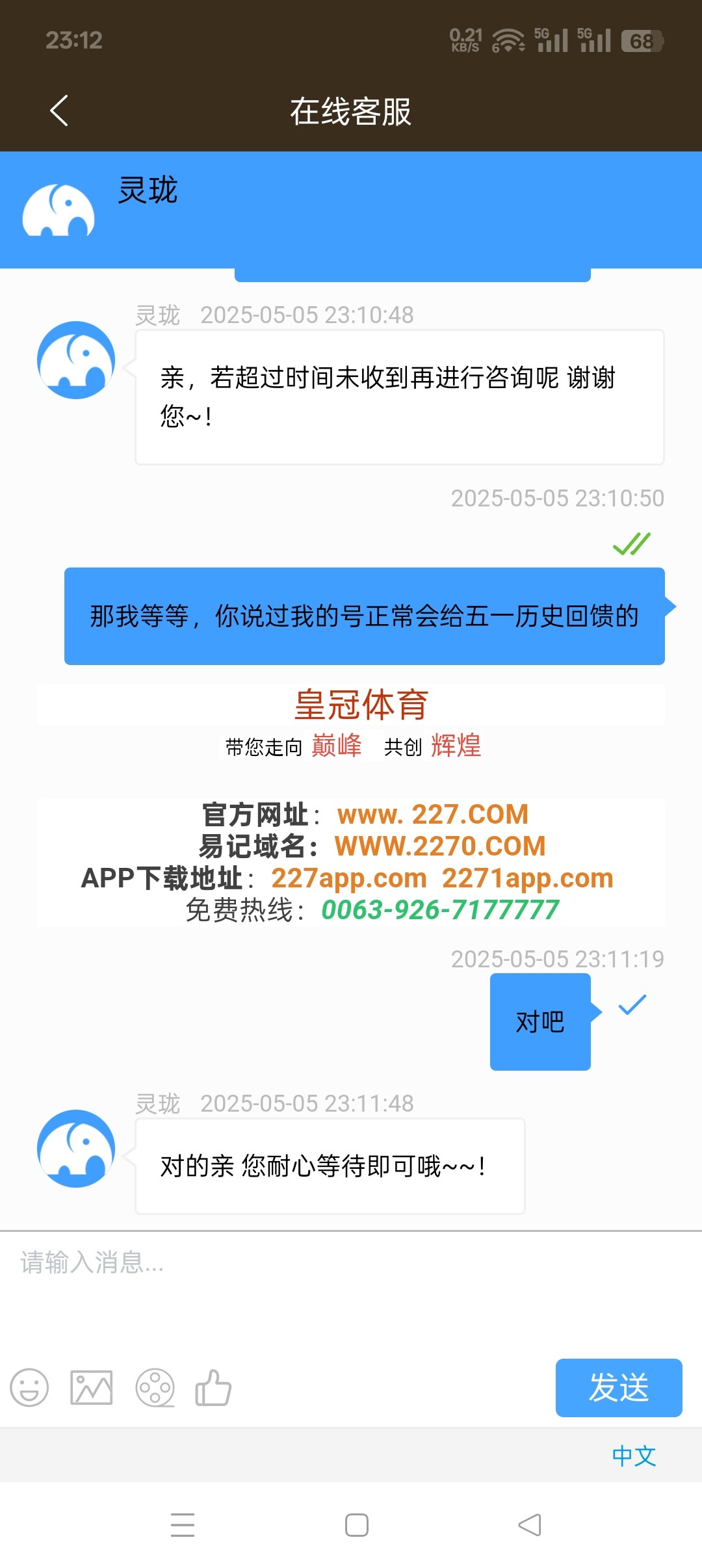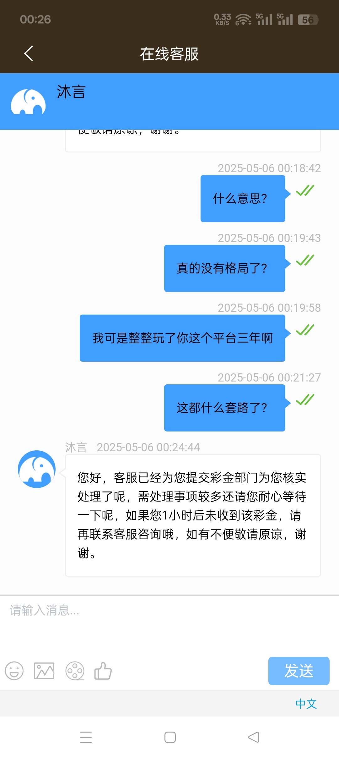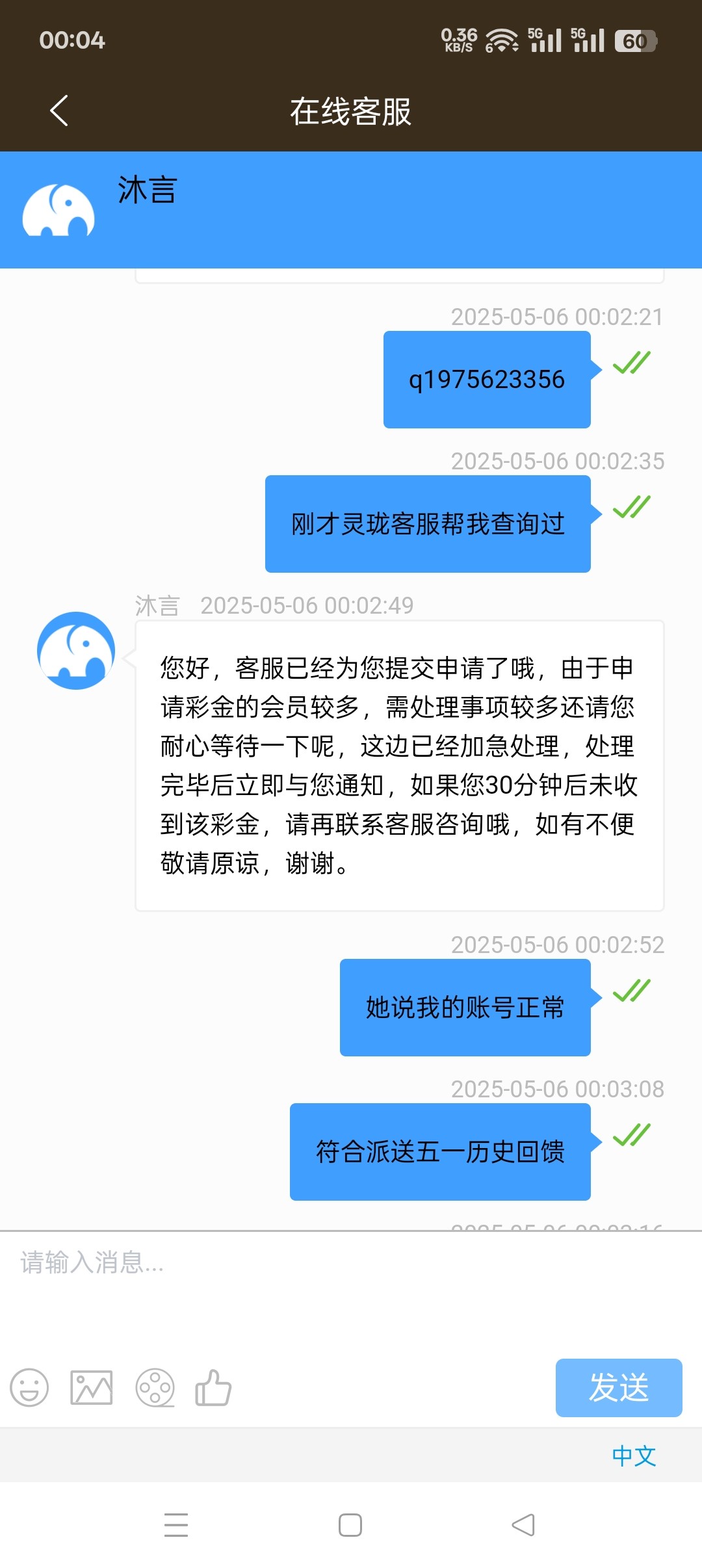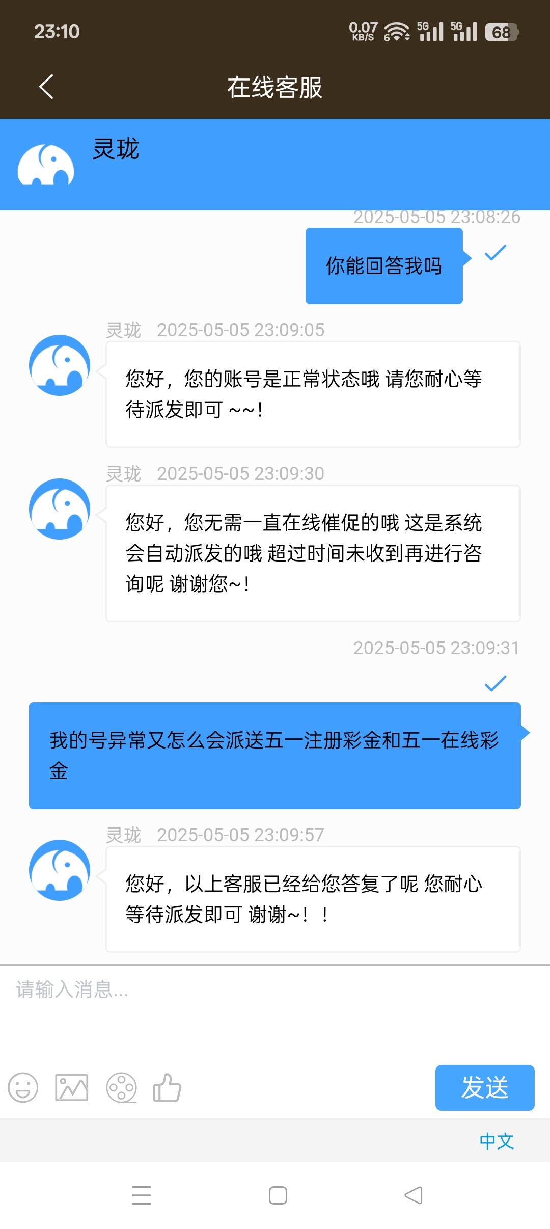 一号就开始说五号之前派送,我今天联系了五个客服,第一个客服说我账号异常,异常送了别的五一彩金?第二个客服说无法查询,那么第一个客服怎么查出的异常?第三个客服说我账号正常符合派送五一历史回馈彩金,第四个客服说符合派送在12点之前没派送再联系客服,第五个客服先说三十分钟内派送,再说一个小时内派送,然后又说今天没派送明天咨询?