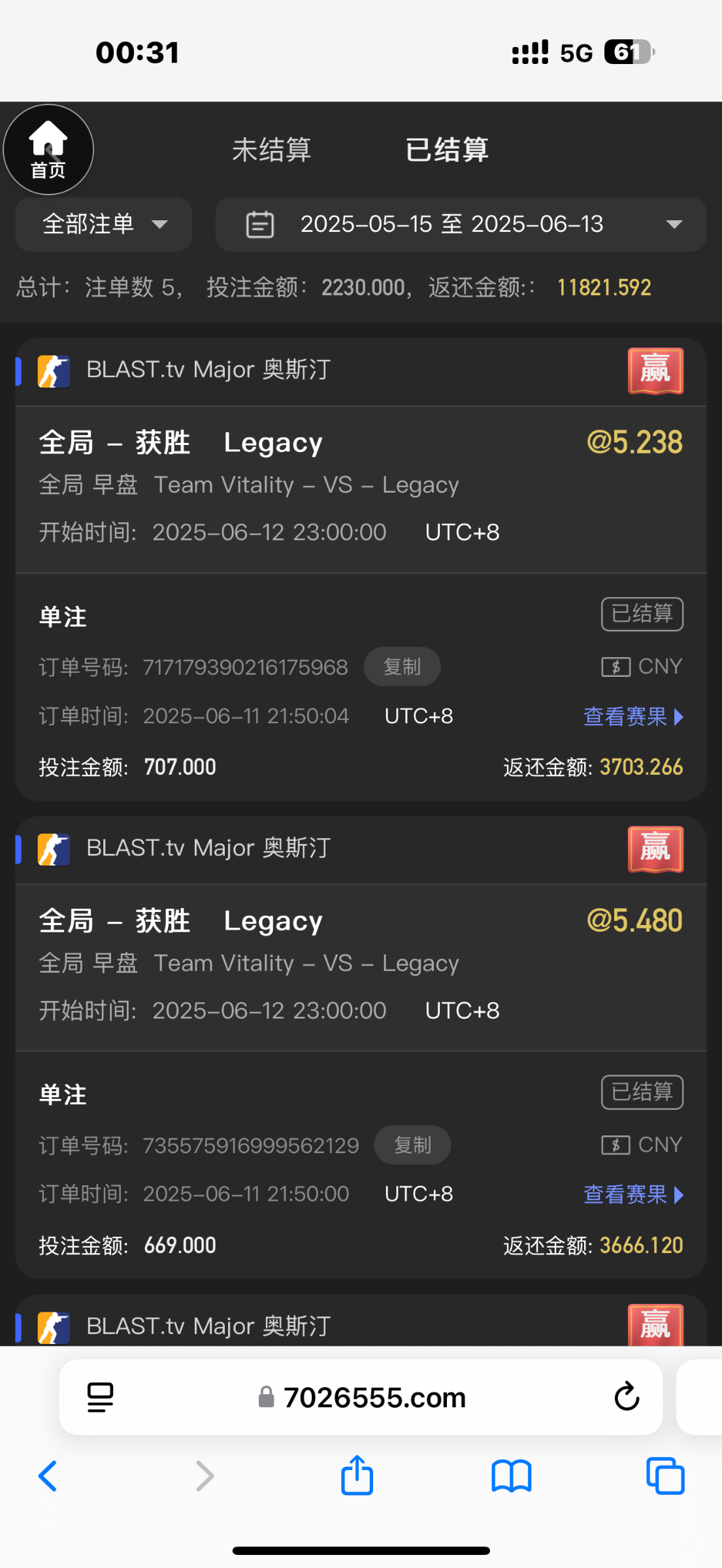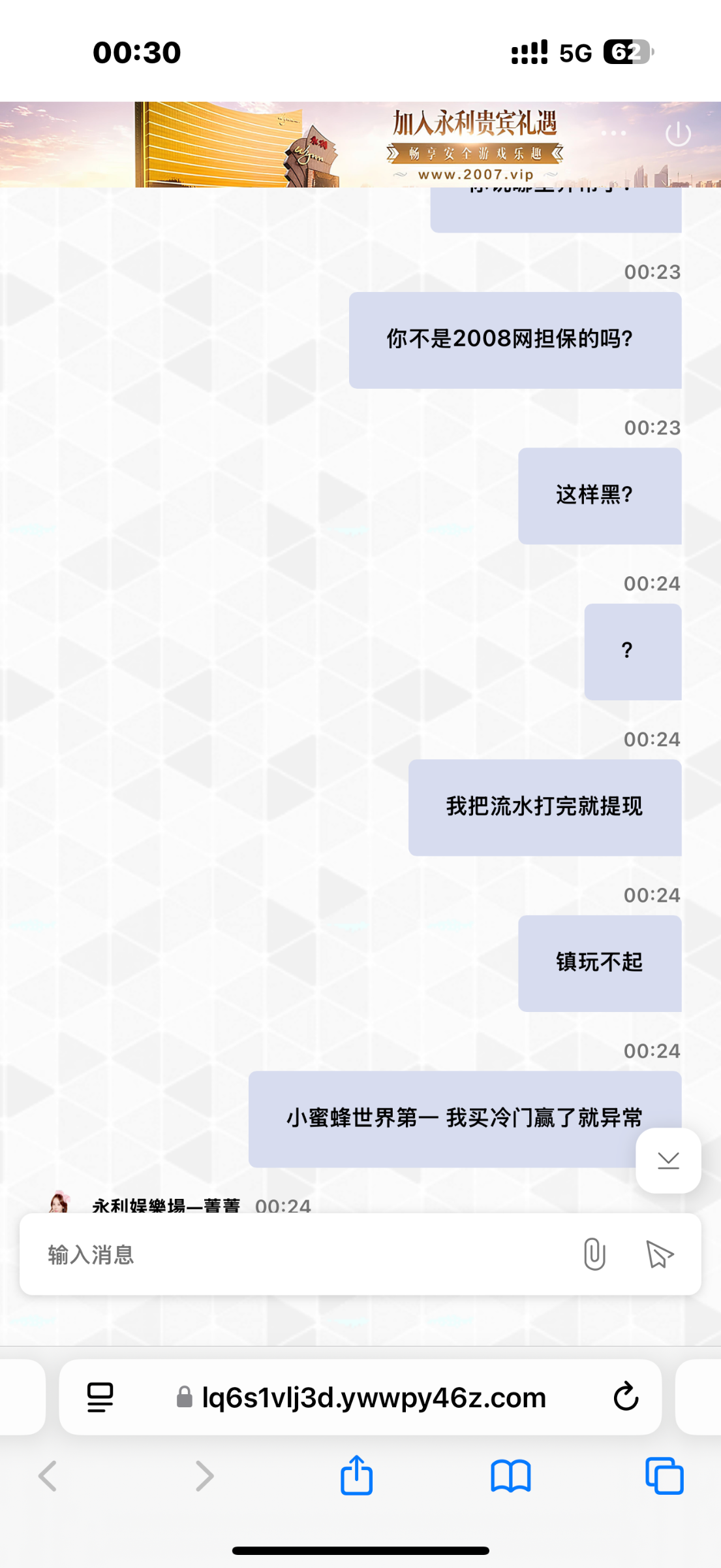 玩csgo电竞比赛 世界第一小蜜蜂打冷门队 赔率5 我下了4000块钱 中了17000 然后去打电子赢到2万 本金是4000 然后平台客服说我电竞注单异常 买冷门也可以异常 上个月刚刚黑过我一万 提现让我打流水打输了(因为之前出过6万没黑)所以这个月就充值去买比赛  然后就黑了 大家注意 2008.com进去的网站全部是黑平台 小心点 赢到2万让我提本金 大家小心点