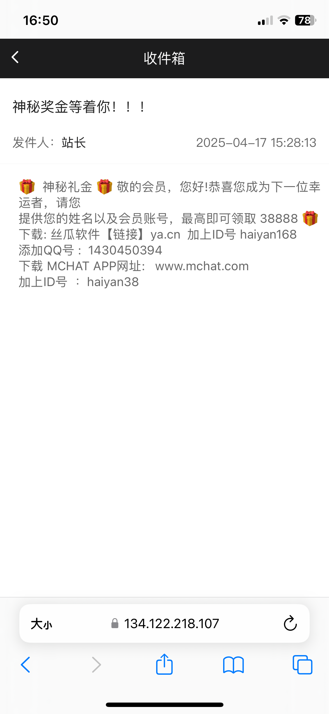 登录进去看到神秘彩金站内信,站内信太多,一个点进去不小心误删