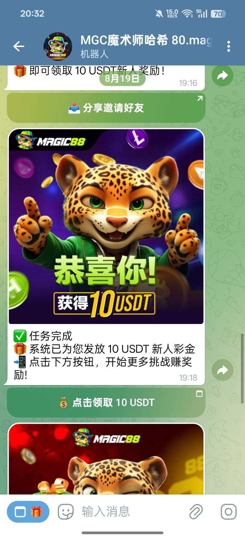 拉自己小号关注机器人加入群组就可以领取10u,没到联系客服叫她添加就行,彩金最多提10u