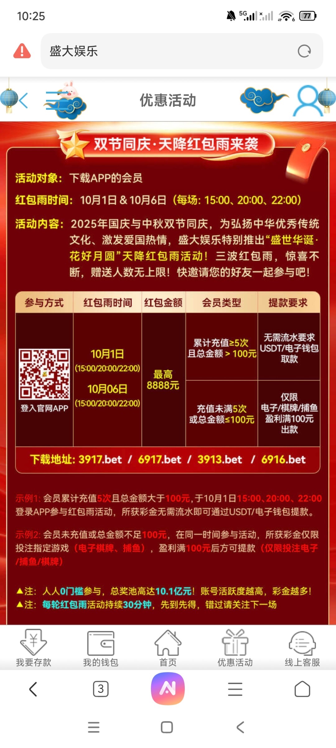 盛大娱乐 网站SDYL.CC 国庆红包活动,15  20   22点可抢三次,未充值也可以