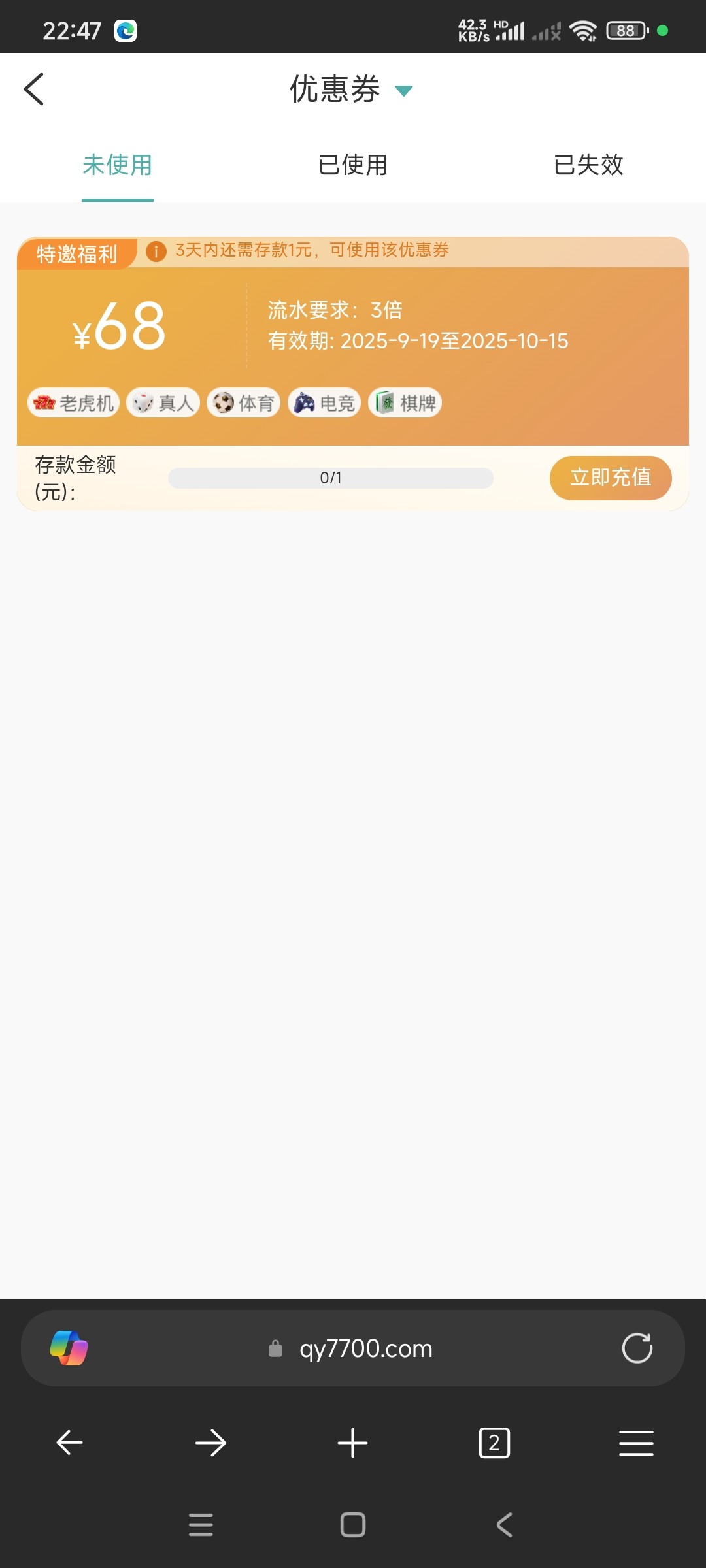 有号的自己上去看,这个68不用申请,福利中心里有就是有,没有就是没有,此外完善信息也有彩金,自行摸索