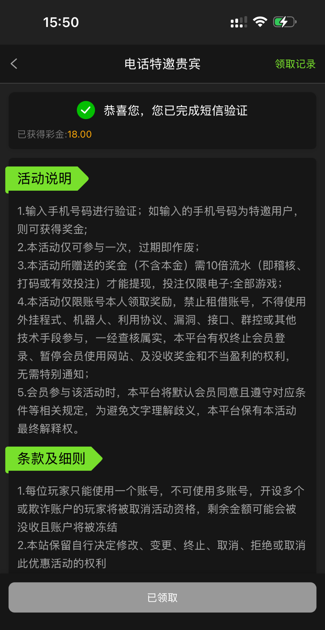 我之前注册领取过,今天打电话登录上去还可以领取,