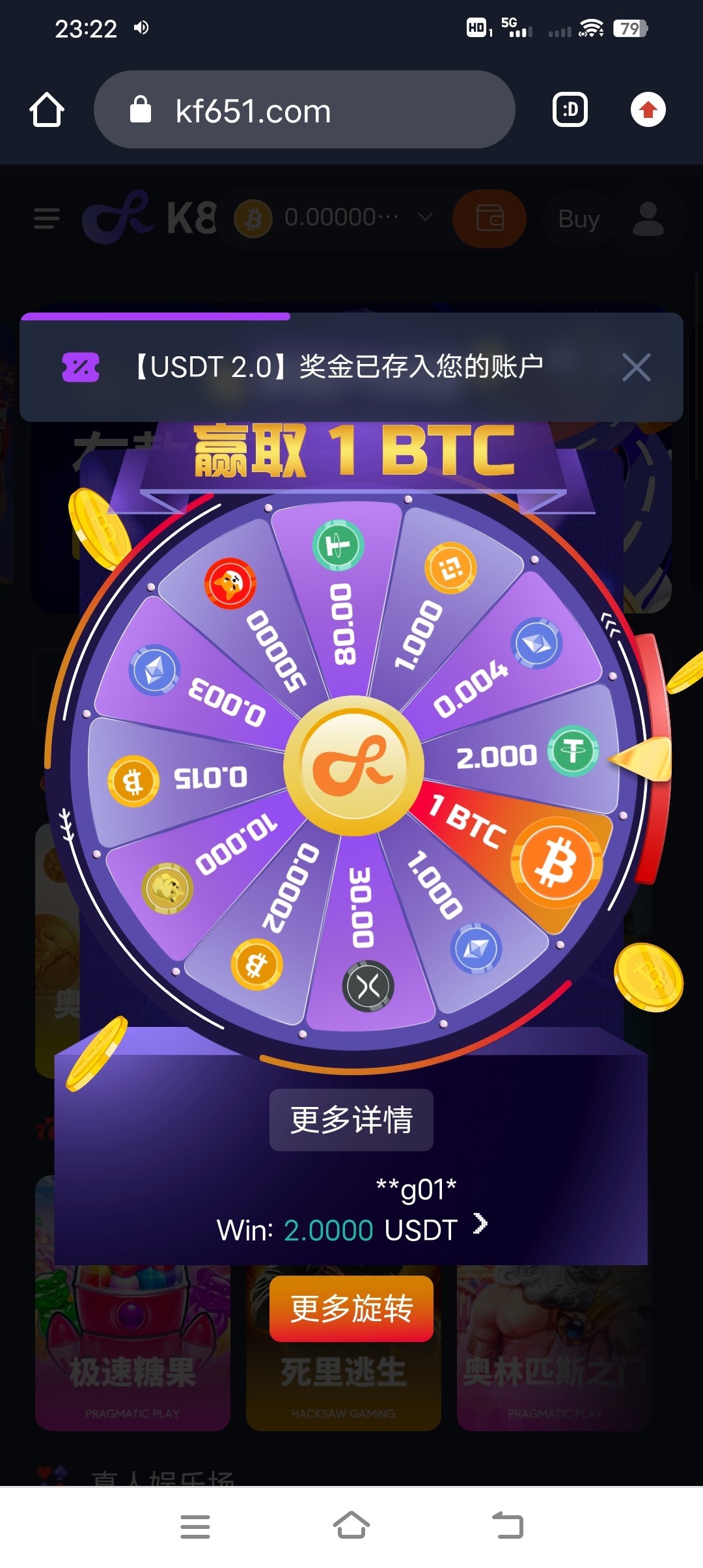 新用户注册看看有没有转盘有可以抽,没有无视,老用户登录上去看看应该有,我自己就抽到了2u,如果没有弹出来就点左上三条杠就可以看到了,有机会抽到一个比特币