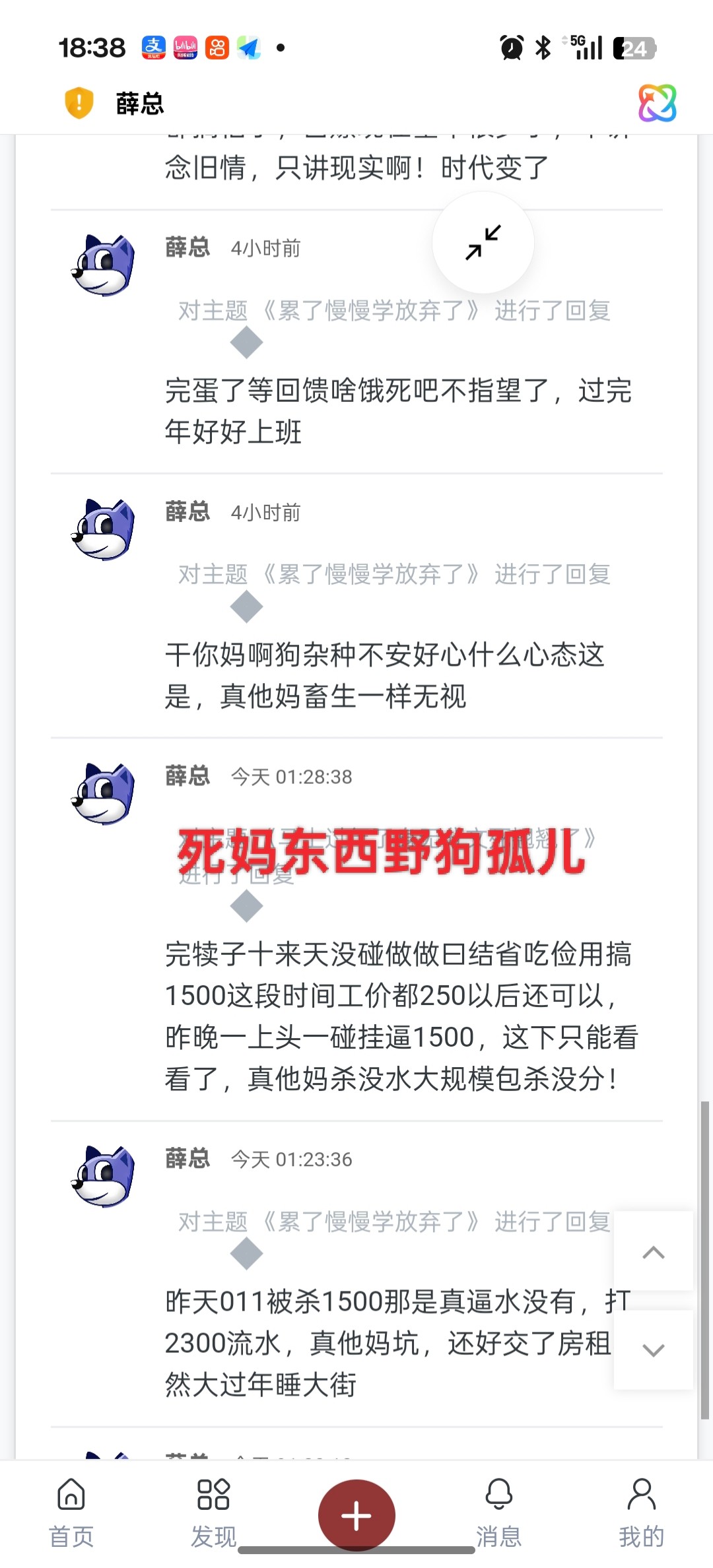 薛总 怎么气急攻心了?说你发些没营养的帖子,急眼了?谁野狗谁知道,看谁都是狗你全家都是狗吧